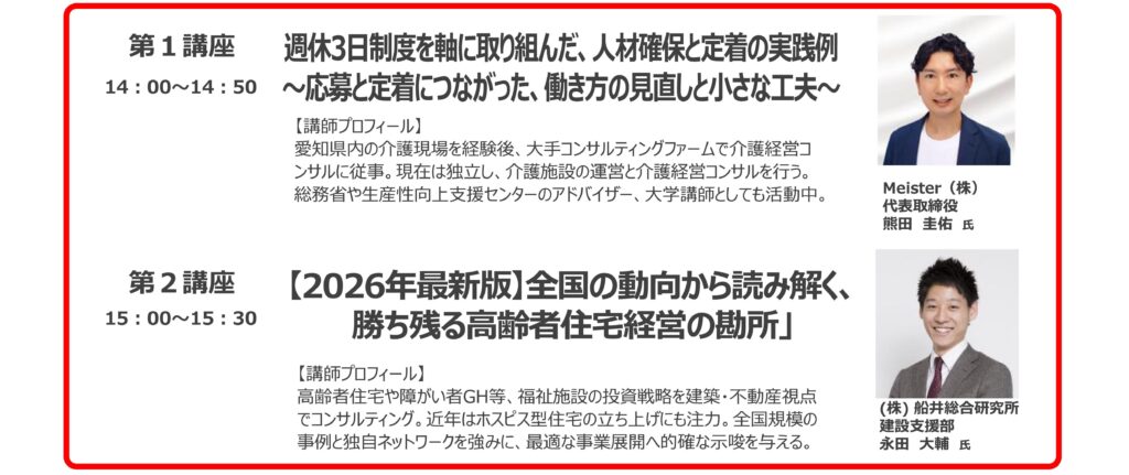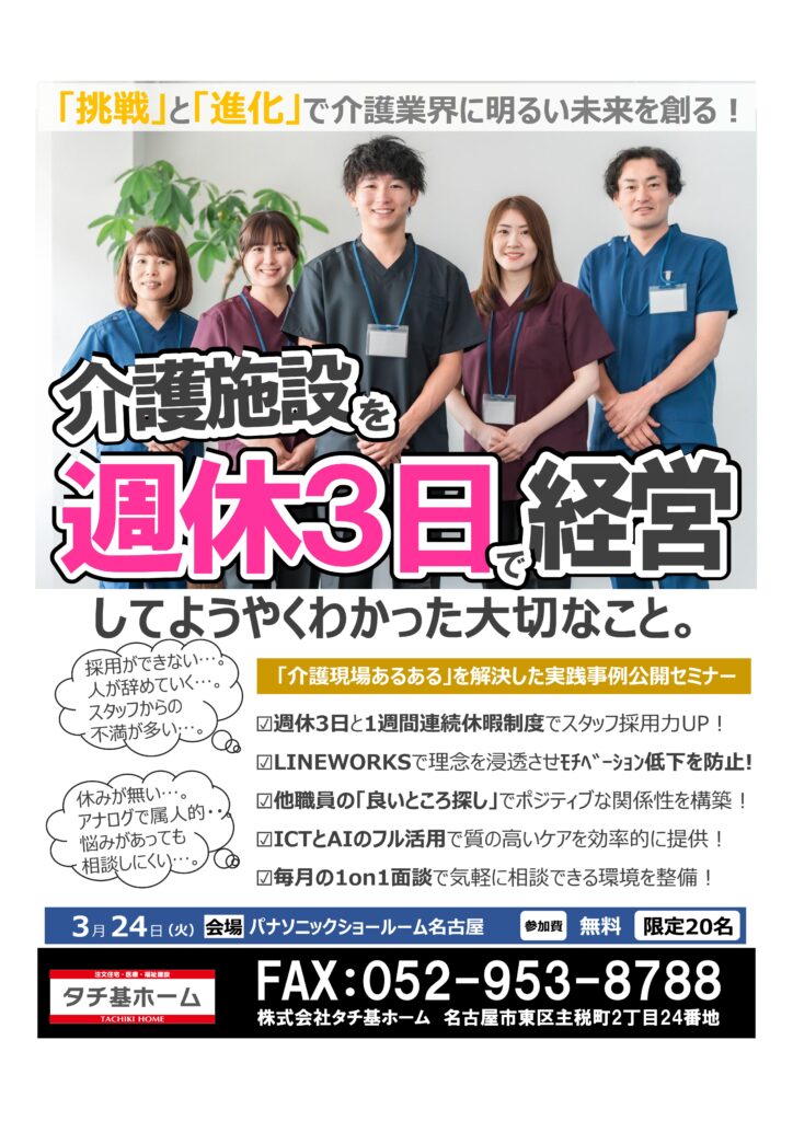 2026年3月3日 / 最終更新日時 : 2026年3月3日 可須水 セミナー 週休3日制度から学ぶ 介護人材定着のリアル事例セミナー 少しずつ寒さも和らぎ、春の気配が感じられる頃となりました。皆様にはますますご清栄のこととお喜び申し上げます。 さて、今年度第7弾セミナーのお知らせです。 【介護事業者様へ】人材確保と定着に悩んでいませんか? 慢性的な人材不足、採用しても定着しない、スタッフのモチベーション管理が難しい——。 介護経営において「人」の課題は避けて通れません。 そこで今回、実際に成果を出している取り組みをもとに、現場改善と経営安定につながる実践事例をご紹介するセミナーを開催いたします。 開催概要【日時】2026年3月24日(火)13:30受付開始【会場】パナソニックショールーム名古屋【参加費】無料【定員】20名(事前予約制)タチ基ホームからのメッセージ私たちはこれまで、多くの介護・福祉施設の建設に携わってきました。建物をつくるだけでは、良い施設経営は実現できません。大切なのは「現場」と「経営」がうまくかみ合うことだと感じています。だからこそ今回は、実際に成果を出している“運営側の取り組み”を学べる機会を設けました。介護業界がこれからも必要とされ続けるために。そして、働く人にとっても前向きな現場をつくるために。皆さまと一緒に考える時間になれば幸いです。ご参加を心よりお待ちしております。参加ご希望の方は、下記連絡先までご一報ください。株式会社タチ基ホーム TEL:052-953-8700(水谷)よろしくお願いいたします。