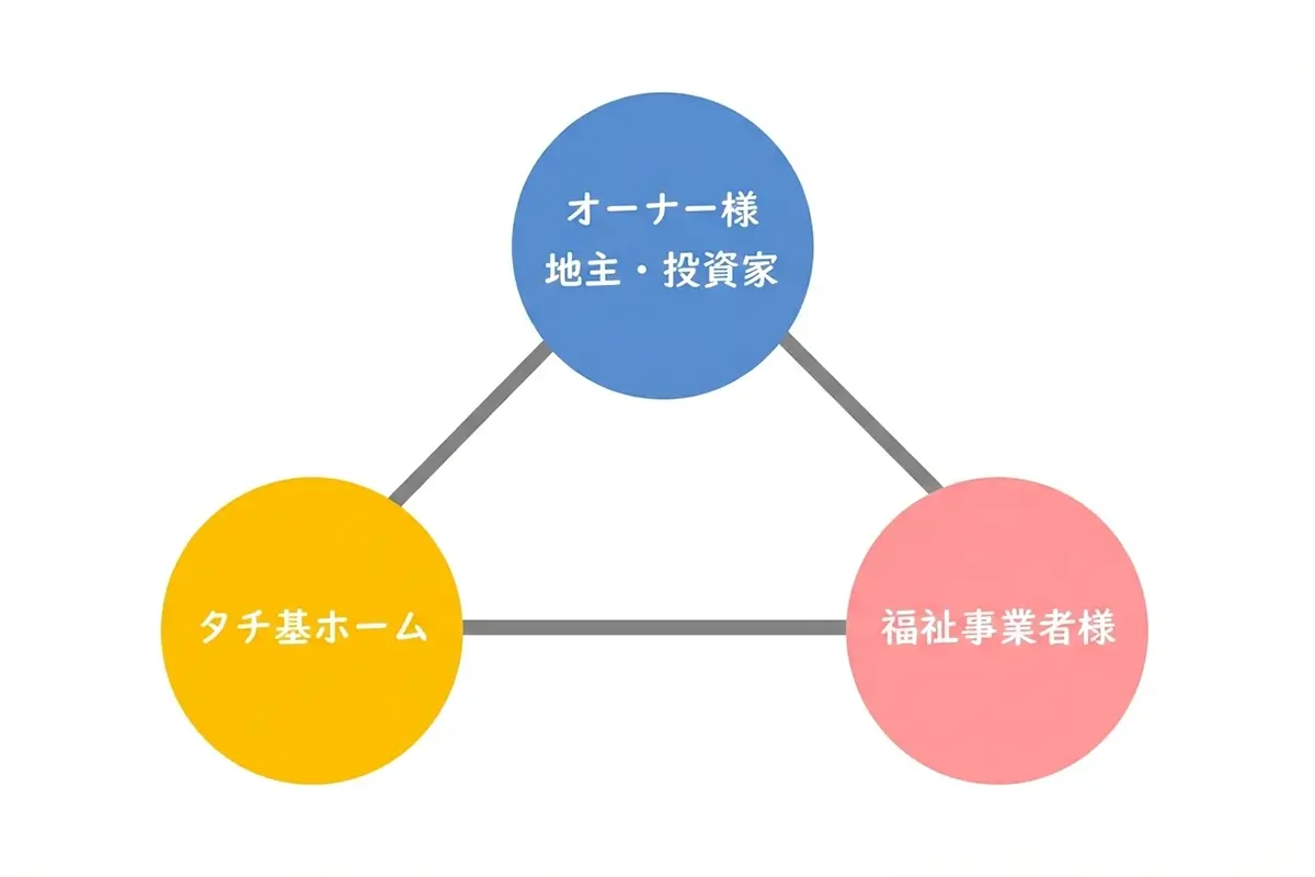 タチ基ホームは事業意欲が高い優良な福祉事業者様を、オーナー(地主・投資家)様にご紹介いたします。