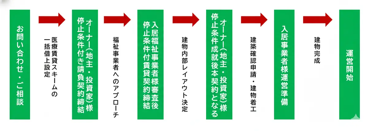 ご依頼にあたっては、はじめに当社と地主様間で停止条件付き請負契約を締結し、その後、一定期間の中で一括借上の希望条件にマッチした介護事業者を誘致いたします。
